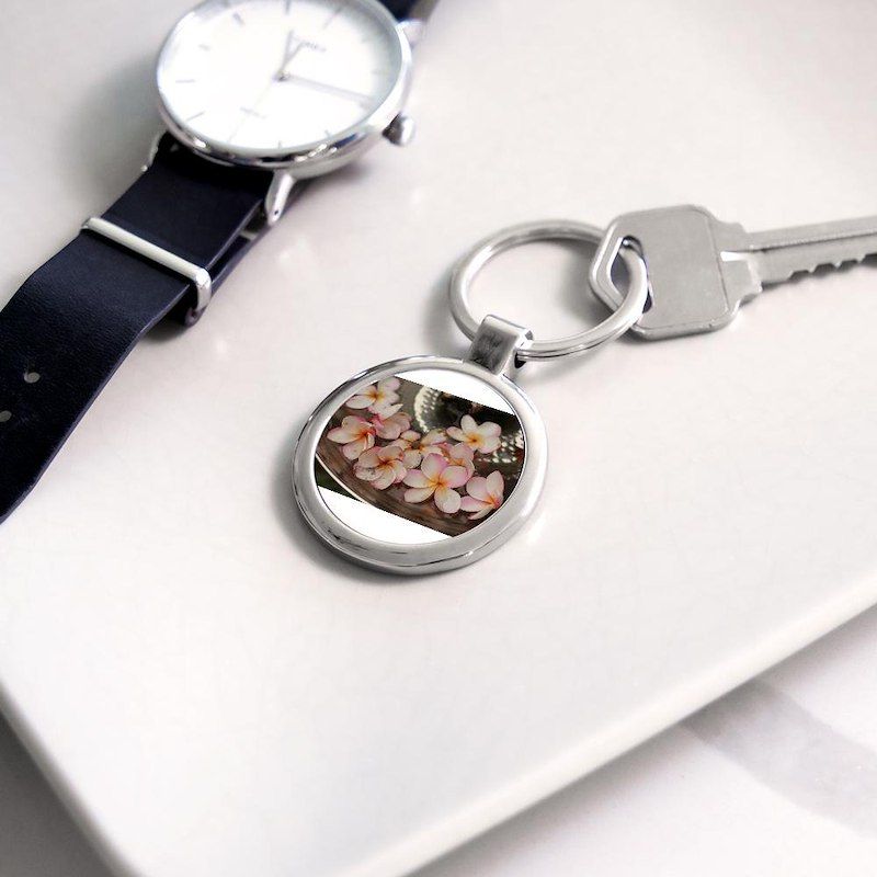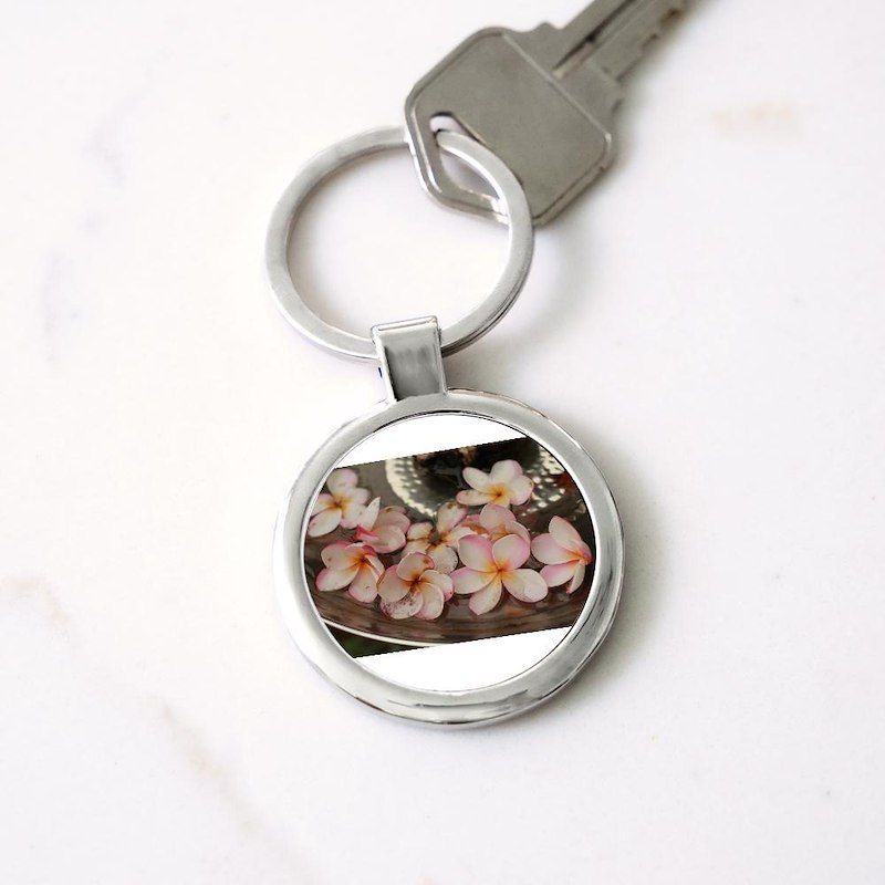pink edged Hawaiian flowers in a m Circle Keychain